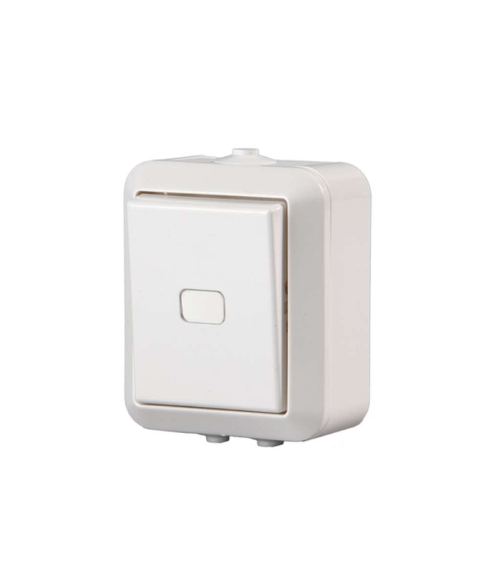 Pinta-asennettava umpikoteloitu kytkin Pinta-asennettava umpikoteloitu kytkin jousiliittimin. Kytkimen rungossa on 2 lisäliitintä joita voi käyttää johtimien jatkamiseen. Liittimiin voi kytkeä max.2 johdinta ja ne on hyväksytty ML ja MK johtimille. Kotelon pohjassa on ylimääräinen potentiaalivapaa ruuviliitin johtimen jatkamiseen tai johtolajin vaihtamiseen. Merkkivalon kytkentämahdollisuus. Toimitus sisältää sekä kirkkaan että valkoisen linssin, mutta ei sisällä merkkilamppua.