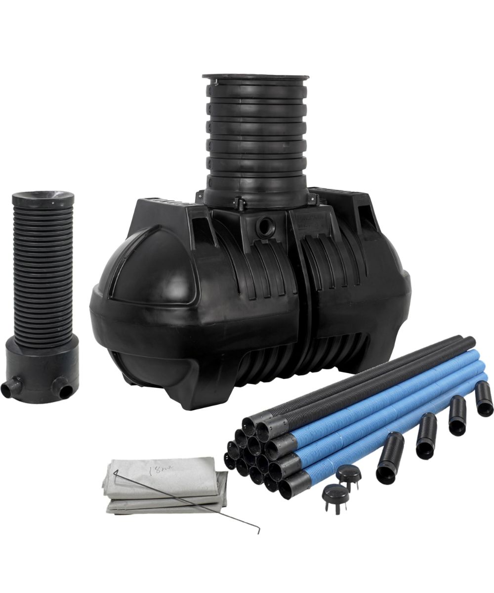 Imeytyspaketti sisältää kolmeosastoisen 2000 litran saostussäiliön sekä tarvikkeet imeytyskentän rakentamiseen.