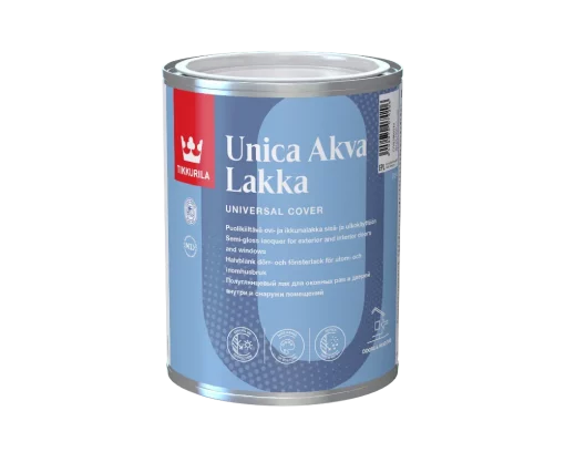 Puolikiiltävä ovi- ja ikkunalakka sisä- ja ulkotiloihin. Unica akva säilyttää ominaisuutensa helteessä ja pakkasessa, eikä kellastu. Tuote suojaa puuta kosteudelta ja ehkäisee puun elämistä ja halkeilemista sekä antaa vahvan UV-suojan.