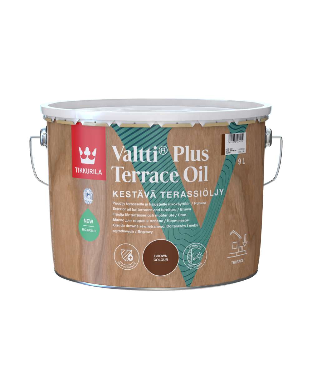 Soveltuu puupuhtaan tai aikaisemmin öljytyn pinnan suojaamiseen ulkona. Sopii kestopuulle (painekyllästetty), kovapuulle, lämpökäsitellylle ja käsittelemättömälle puulle. Valtti Plus Terrace Oil muodostaa pinnan, joka on UV-suojattu, tämä on erityisen tärkeää käsiteltäessä terasseja ja pihakalusteita. Valtti Plus Terrace Oil on helppo levittää ja kuivuu nopeasti. Valtti Plus Terrace Oilin kirkkaat intensiiviset värit lisäävät pinnan kestävyyttä sisältämänsä erikoispigmentoinnin ansiosta. Valtti Plus Terrace Oil on saatavilla Ruskeana, Kelonharmaana ja Mustana.