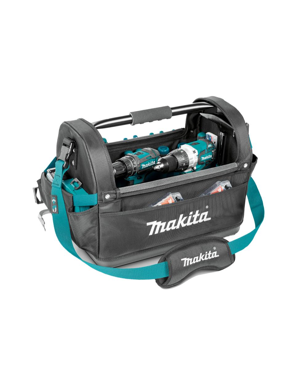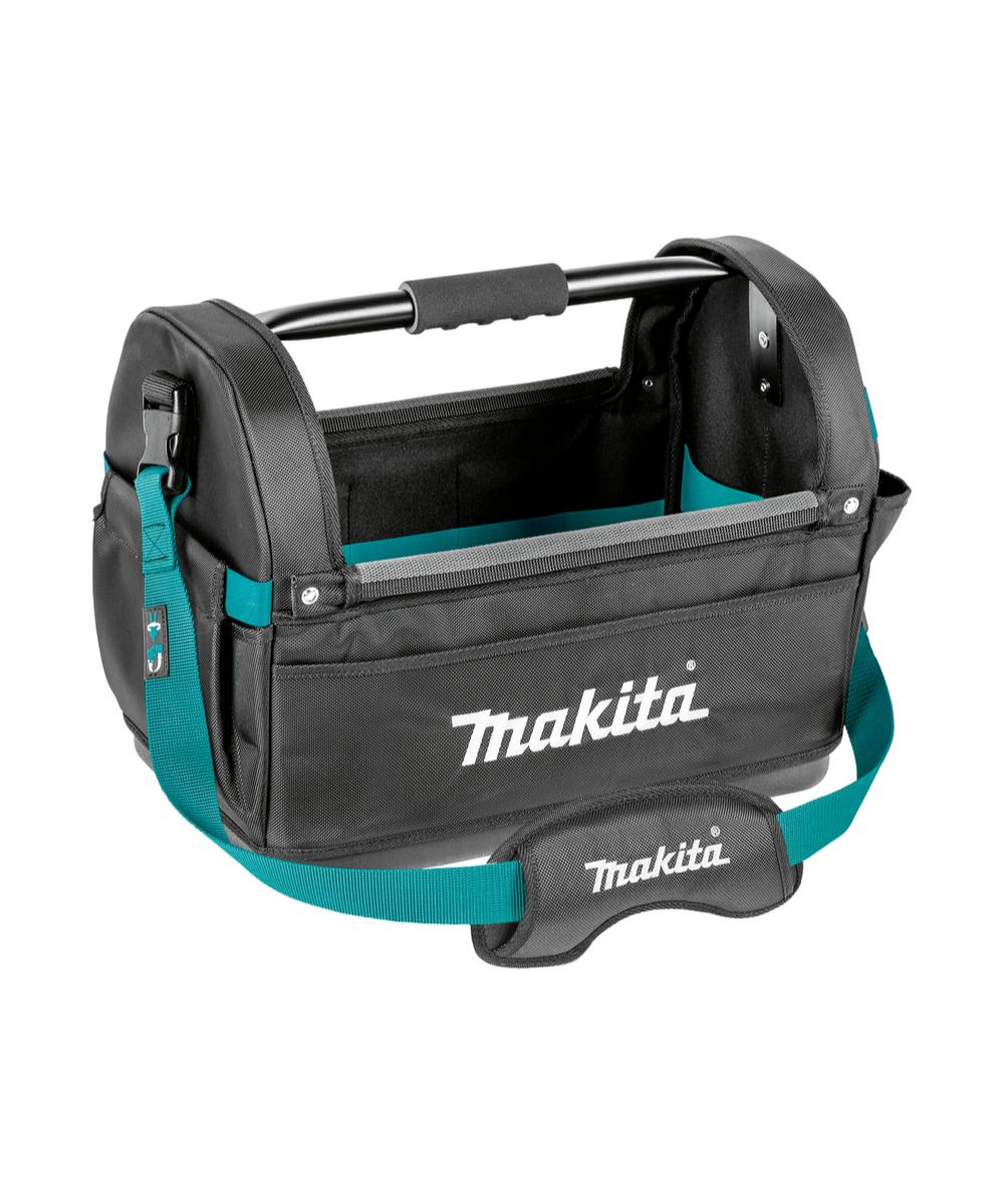 Makitan avonainen työkalulaukku E-15403 on erittäin käytännöllinen kestävistä materiaaleista valmistettu laukku työkalujen ja tarvikkeiden kuljettamiseen niin työmaalla kuin kotonakin. Laukun ulkopuolella on yhdeksän erikokoista taskua, joihin saa laitettua käsityökalut mielensä mukaiseen järjestykseen. Sisäpuolella on yksi laukun sisätilan levyinen tasku ja kahdeksan eri kokoista joustavalla nauhalla varustettua kohtaa mihin työkalut voi laittaa. Kova pohja suojaa työkaluja iskuilta. Teräksisestä kantokahvasta saa hyvän otteen vaahtomuovisen päällysteen ansiosta.