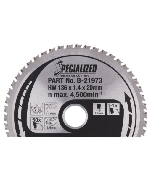Specialized pyörösahanterä 136 mm halkaisijalla ja Z-50 hammastuksella metallin sahaamiseen. Terä soveltuu akkumetallipyörösahoilla käytettäväksi.
